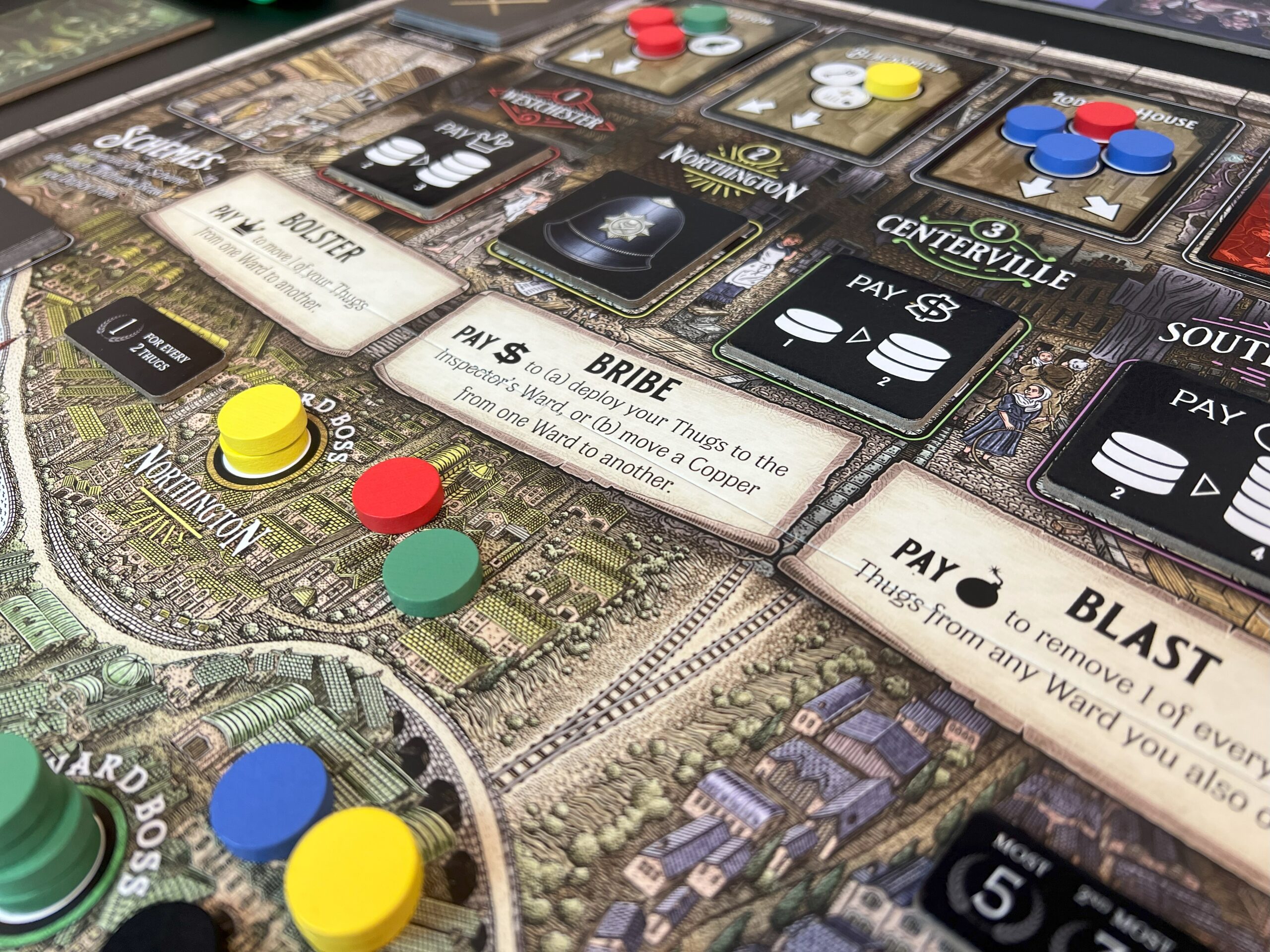 5 Wards is played over a number of rounds, and your goal is to deploy your Thugs to the map to gain control of the city. Each of the 5 Wards has a different Victory Point (“VP”) scoring condition, drawn randomly at setup. Each ward scores only once at the end of the game, so every point is precious! The final round is triggered when the Landmark deck runs out, after which the Gang with the most VPs is the winner.