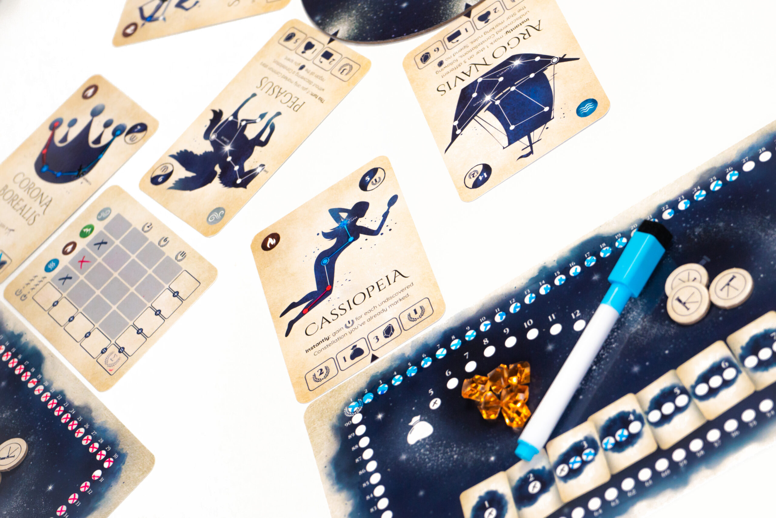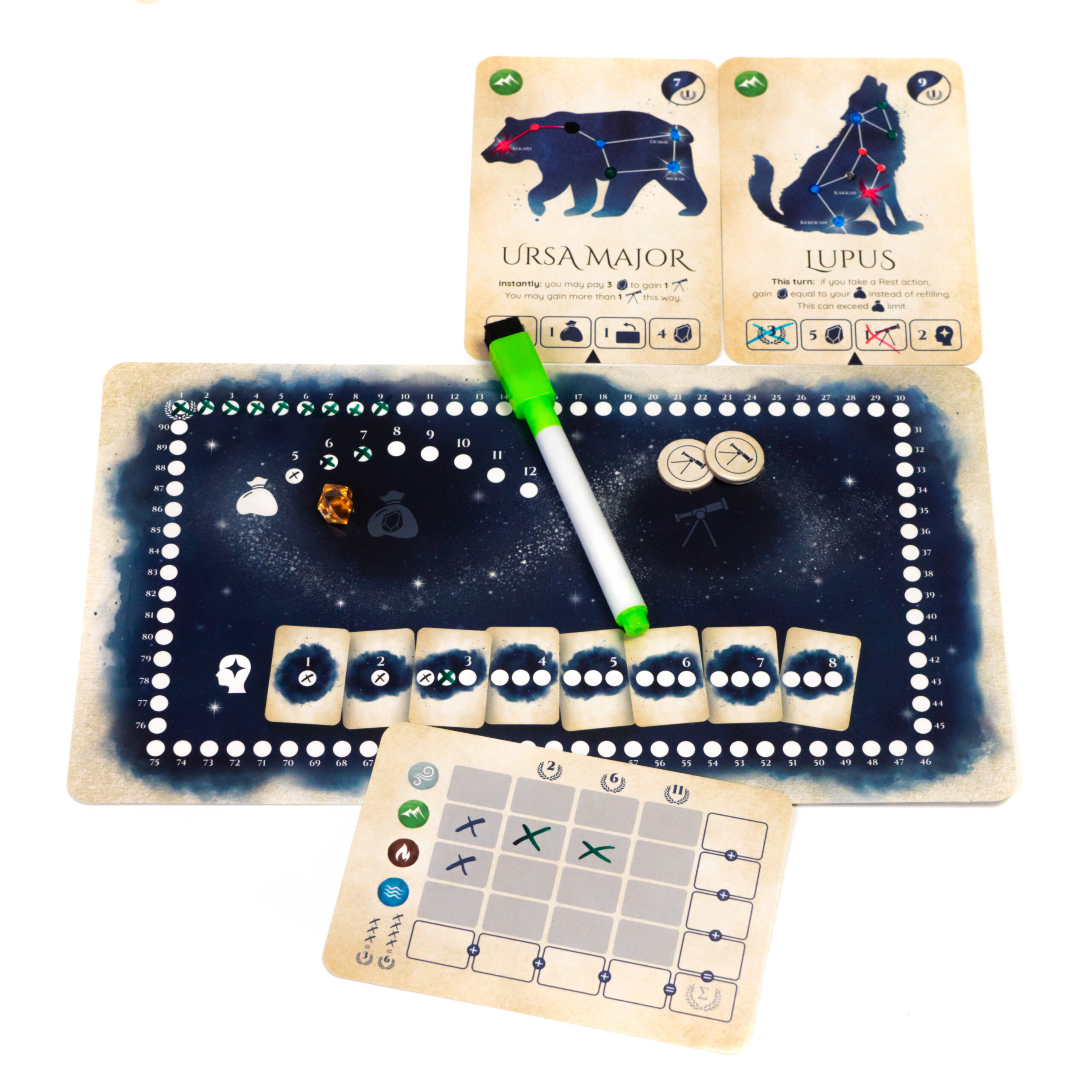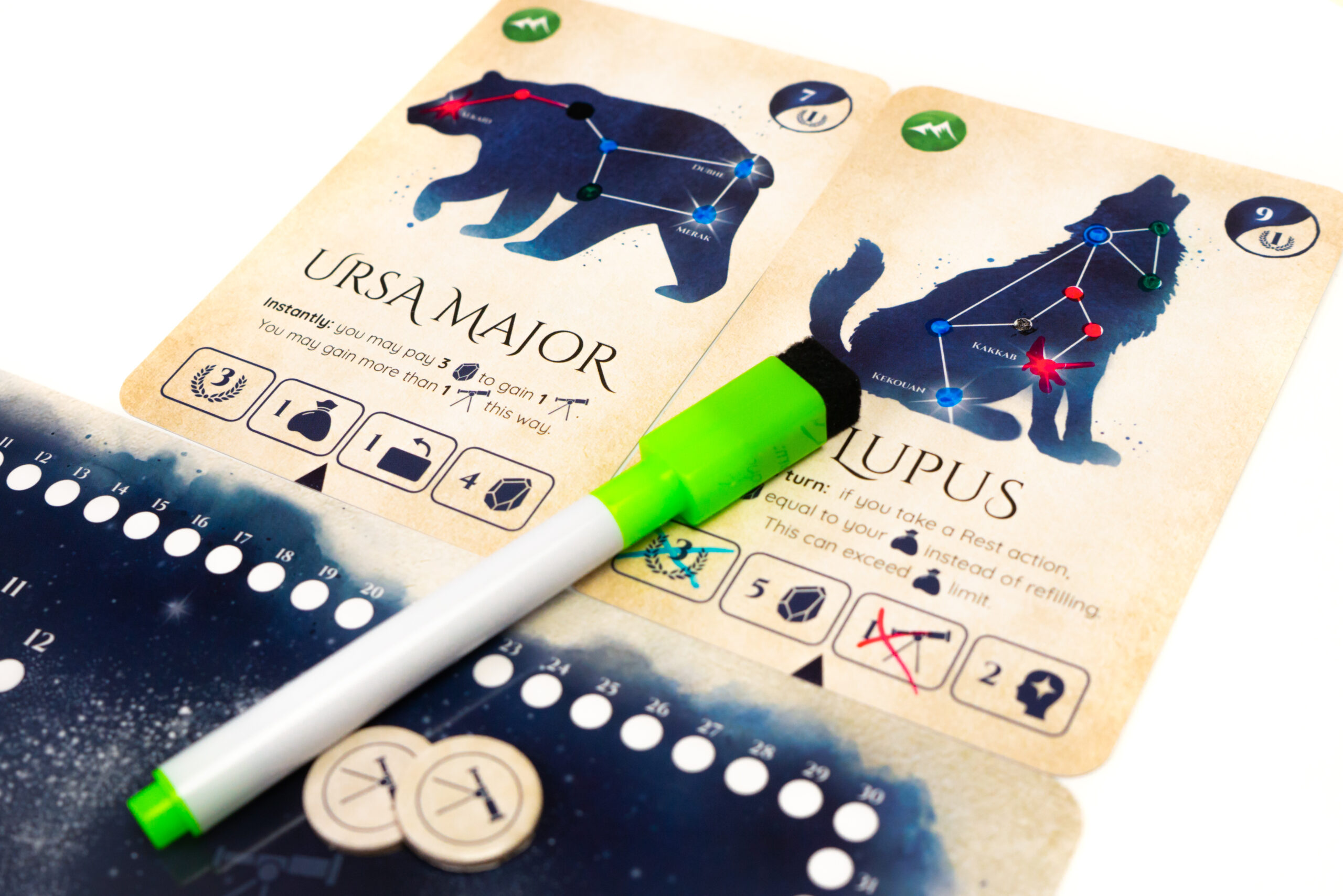 The Observe action allows you to spend Stardust to discover stars on the Constellation cards using your dry erase marker. You may only mark stars in a straight continuous line, but you may spend Telescope tokens to start new observations. As soon as you mark the last star in a Constellation, you take the card from the Night Sky, granting you a powerful reusable ability for the rest of the game. But other players also benefit from the discovery: based on how many stars they marked, they may choose one of the card’s instant benefits (Boons) at the time it is discovered.