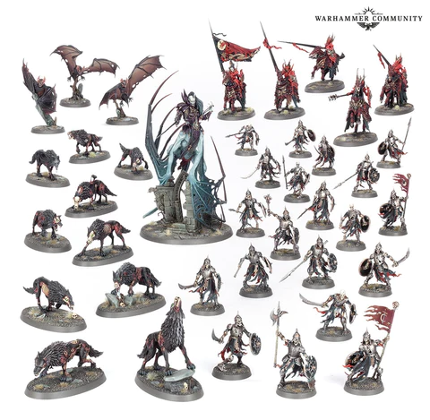 Unleash undead nightmares from the shadows, and swoop in for the kill with this boxed set. This force is led by a bloodthirsty Vengorian Lord and a cadre of noble Blood Knights. As they charge into action, their foes are swarmed by Fell Bats, hordes of freshly risen Deathrattle Skeletons, and packs of Dire Wolves. Prepare to gorge yourself on the blood of your foes!