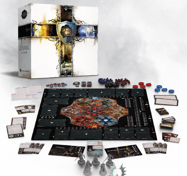 Duel – Lex introduces a new way to play fast and exciting two-player mage fights! Two mages clash in the cramped underground rooms of a Templar stronghold, choosing and planning spells and actions from a common deck and managing their own evocations and resources.