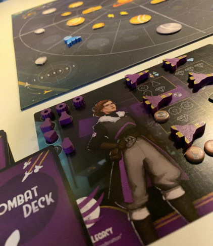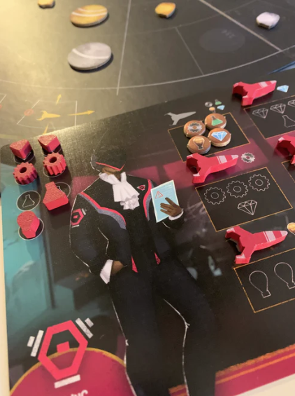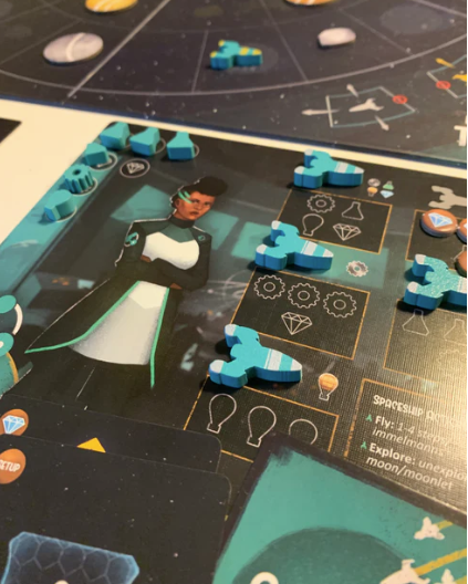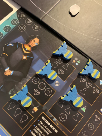 Fly – move a number of spaces determined by which orbit your ship starts in. Your ship must move in the direction of the ships color, but doesn’t have to be the color of the orbit it’s moving through