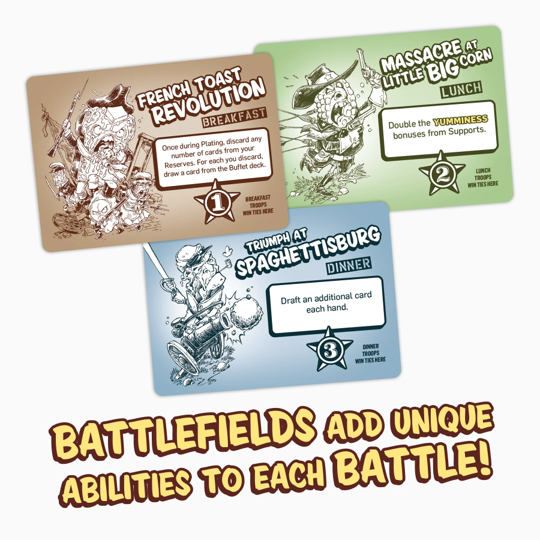 Each round of Food Fight: Reheated is a meal. Players will draft eight basic cards (Troops and Supports), and be given one powerful Mascot card to use this round or save for a more opportune moment later. Then, players each create an army of up to five troops, and serve them up one at a time to fight over the current meal’s Battlefield. Many troops have thematic powers and synergies – combinations such as stacks of pancakes, bacon and eggs, and chicken and waffles will surely be of use.