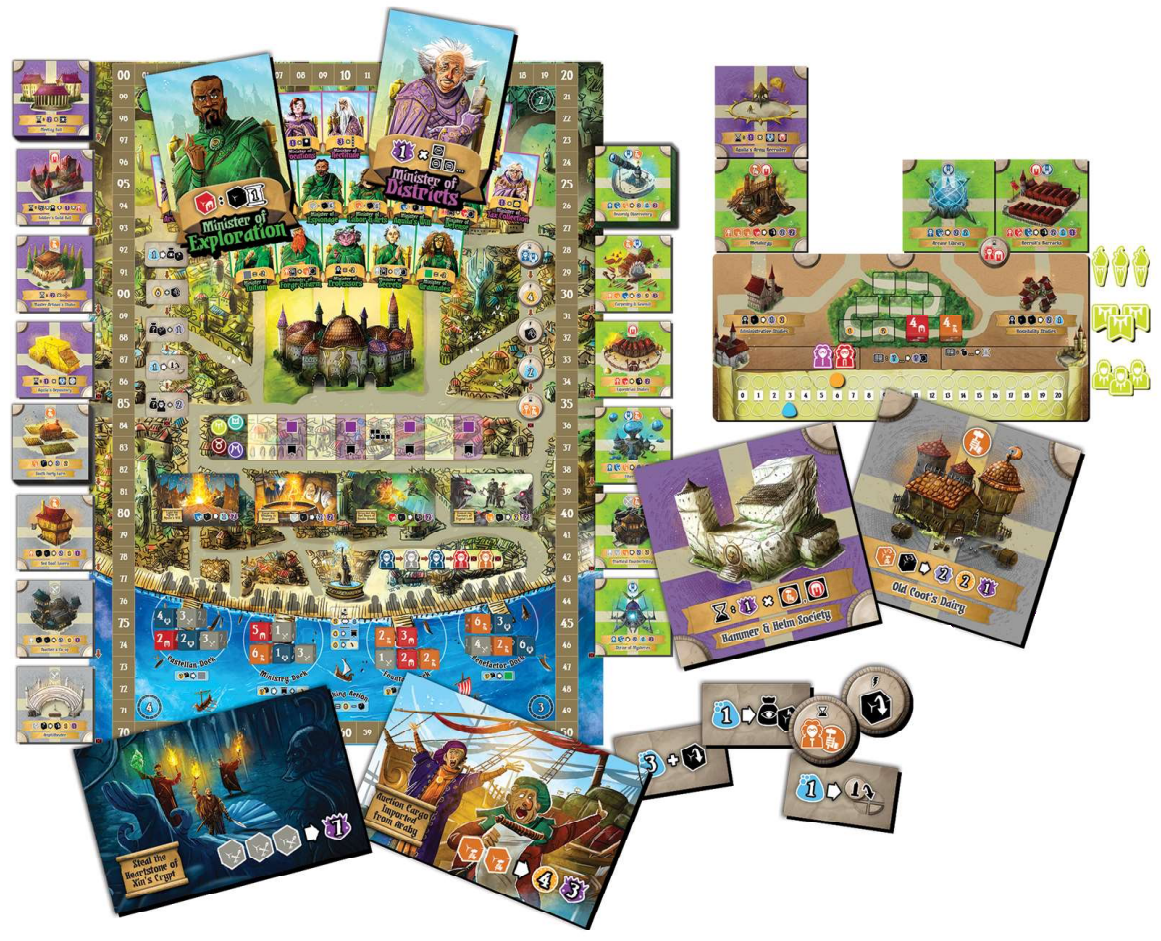 Guild Academies of Valeria takes place over a series of rounds and phases. In the Recruitment Phase you will send stewards to the city docks to draft students (dice), academy tiles and professors. In the Education Phase you will assign students and professors to your growing academy to advance their knowledge. In the Questing Phase you will send graduates on assignments that need their particular traits. While all of this is going on, you also be building monuments within your academy for powers, seeking favors to increase your abilities, and courting the influence of key members of the 20-strong city council. Their help and influence will mean everything when they judge your completed academy.