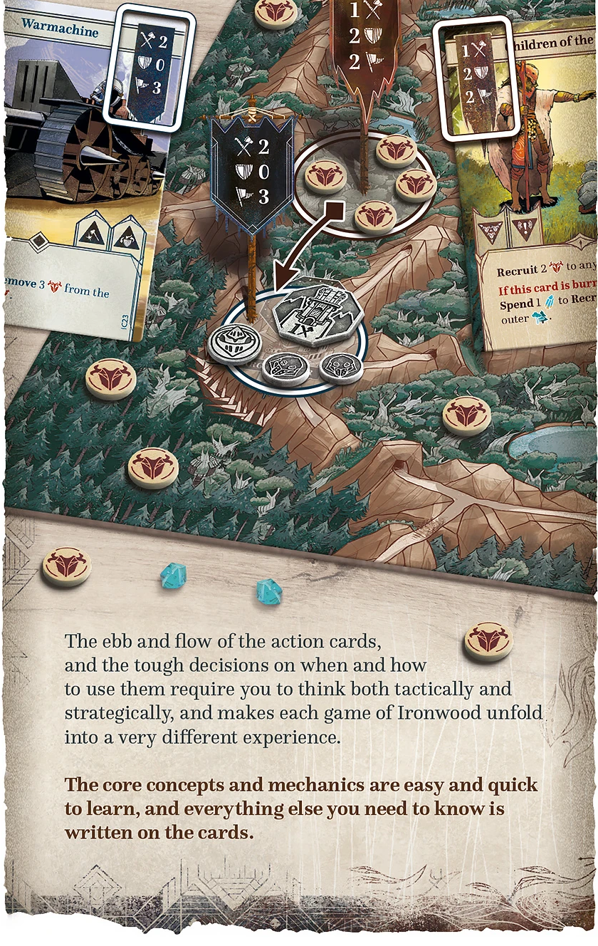 Ironwood is a rules-light, highly asymmetric, card-driven tactical game for 1-2 players. Each round, you and your opponent alternate playing a total of 3 of your faction-specific cards for their action effects. These effects include positioning your warbands, initiating combat, extracting crystals, bestowing temporary passive effects, and many more. When combat occurs, you will use the same cards for their combat values instead, in a simultaneous bid to gain combat bonuses, inflict and fend off casualties, and augment the Dominance value of your warbands to win the combat.