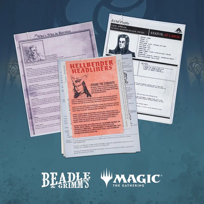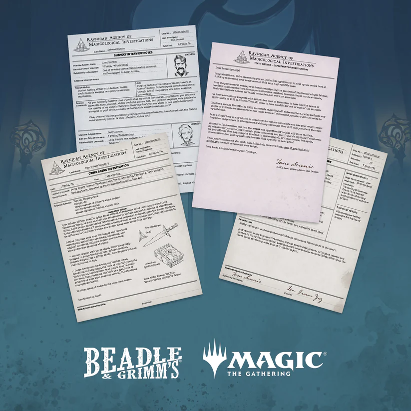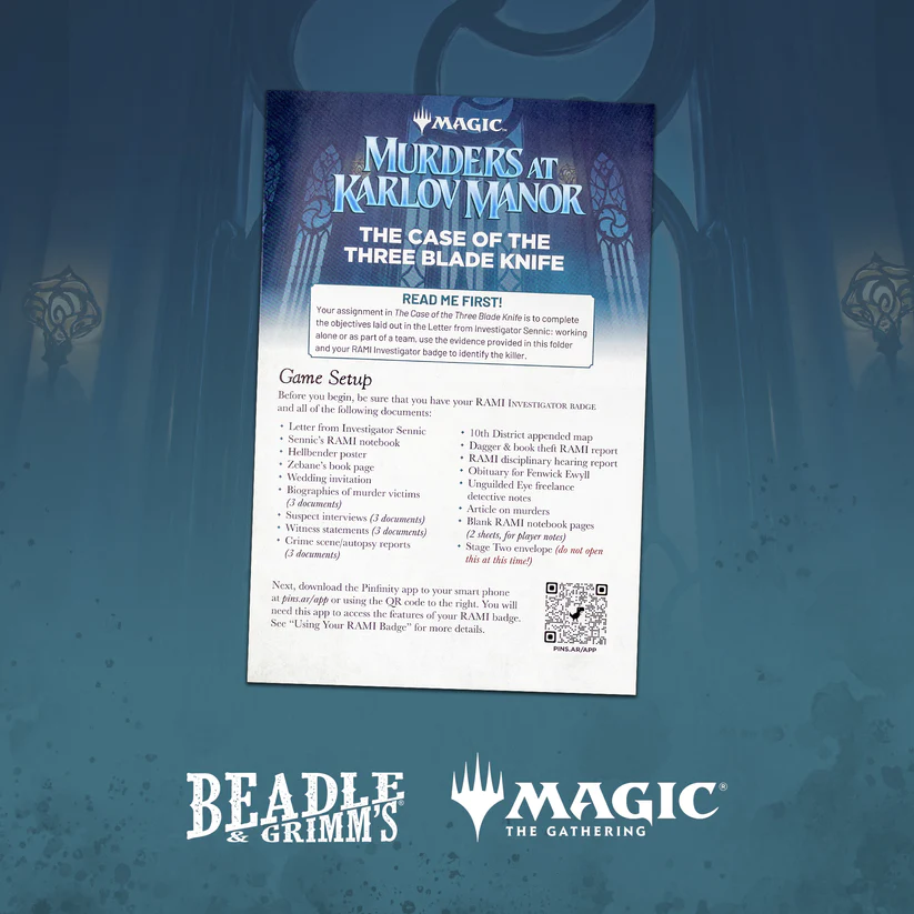 Pore through Lead Inspector Tam Sennic’s evidence and use the augmented reality embedded in your Ravnican Agency of Magicological Investigations (RAMI) badge (3″ x 3″ by Pinfinity) to identify suspects and bring a killer to justice!