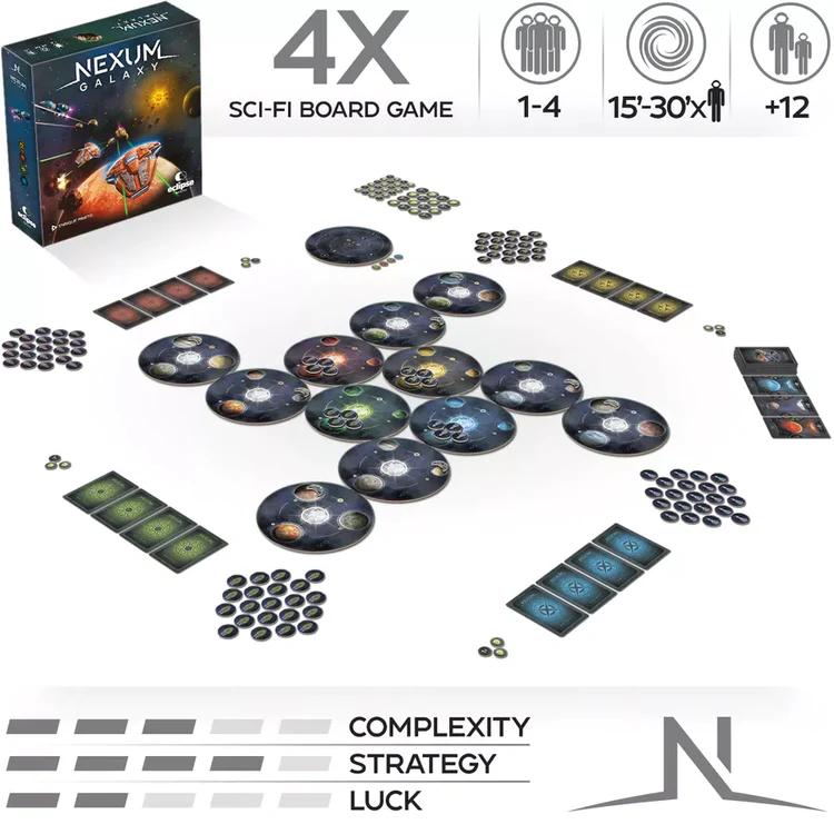 Nexum Galaxy is a game for 1 to 4 players from 12+ years old, in which we fight against other Civilizations in epic interplanetary battles to dominate the Galaxy. With simple and intuitive rules that can be learned very quickly, but at the same time with a high tactical and strategic component. You will be able to eXpand and eXploit resources from each Galactic Sector while eXterminating your enemies. Allows hundreds of different games with progressively increasing difficulty, from pure strategy without chance to the incorporation of Cosmic Events to which you will have to adapt your strategy. Special modes solitaire, cooperative, and with or against several Artificial Intelligences. Excellent presentation, with its plastic insert, initial help guide and advanced guide. It is enriched with the expansion “Nexum Galaxy: Asteroids” that turns it into a 4X, adding eXploration and countless game modes, scenarios and components.