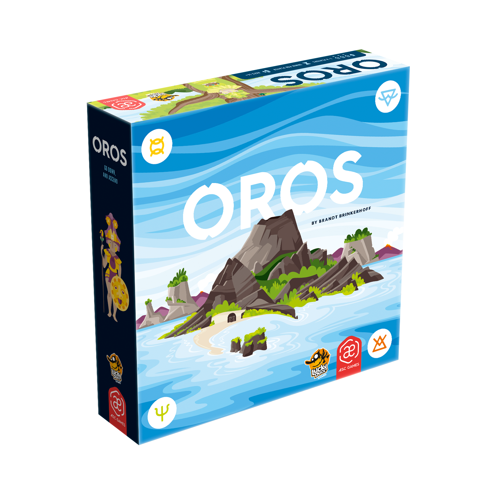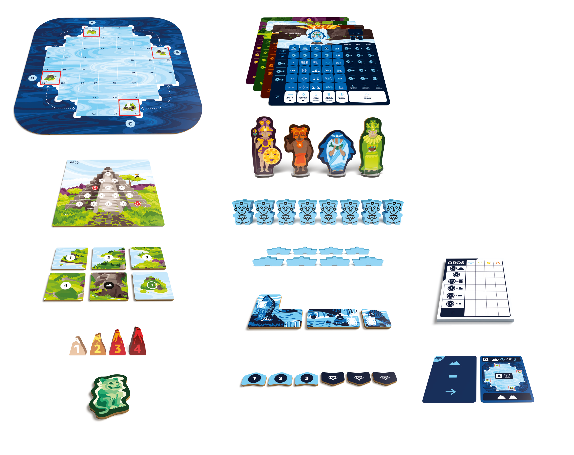 Oros is a tile-colliding, volcano erupting, mountain-making, wisdom-gathering, action-economy strategy game. On individual player mats, players move their Followers between action spaces, allowing them to manipulate a shared environment like a giant puzzle of plate tectonics. Action spaces allow players to shift rows of land, move and collide land tiles, form and erupt volcanoes, worship to gain wisdom, journey their Followers around the ever-shifting landscape, and build sacred places of study and worship on mountains. Building sacred places and worshipping in sacred places brings wisdom which is used to improve the abilities available for each action space. Wisdom is also used to improve the end game value of each sacred place built as well as reach other goals worth end game points.