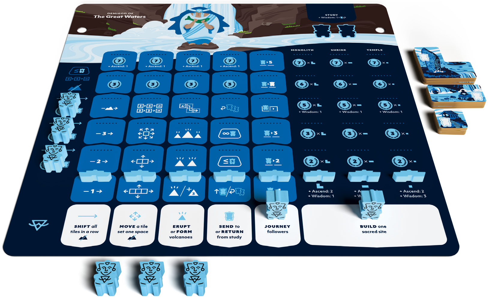 When building sacred places, the Demigods of the Wise One ascend a ziggurat which acts as a timer toward the end of the game. When one reaches the top, players finish the round and then tally a final score.