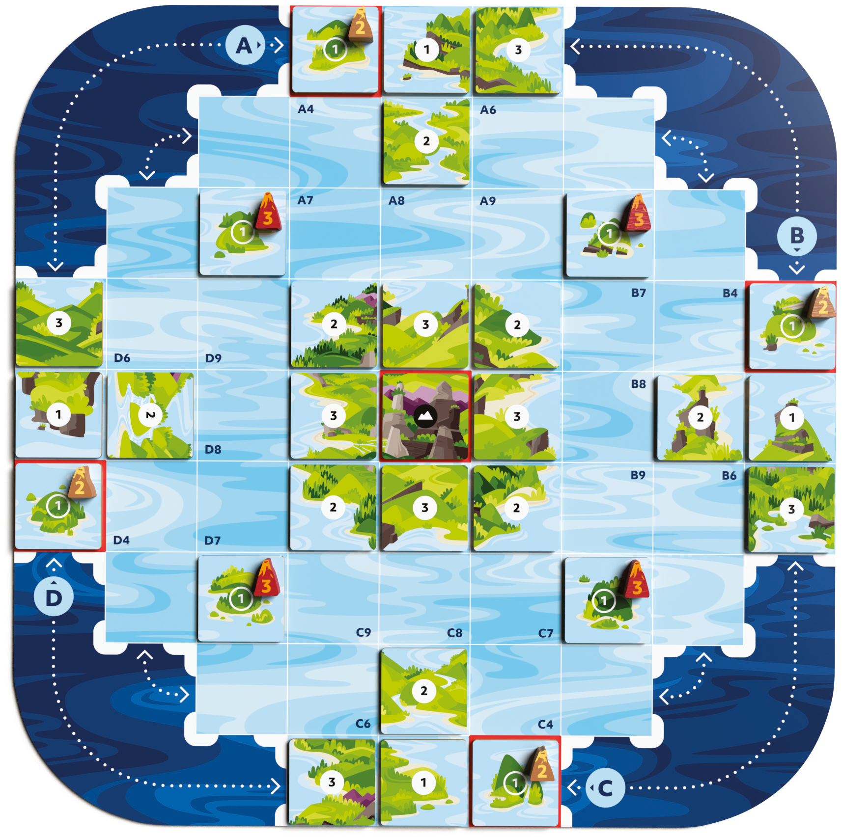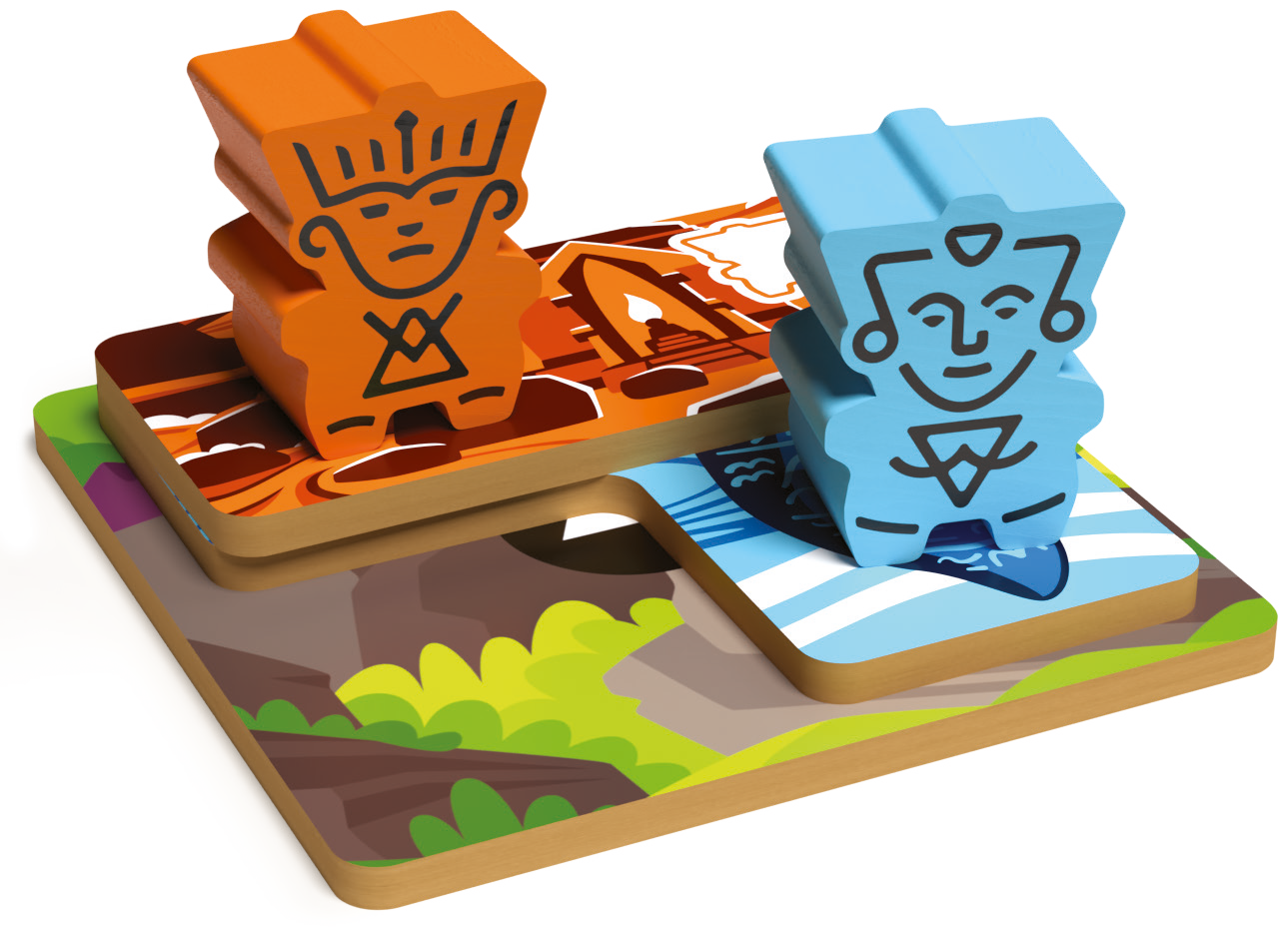 At the core of Oros is the unique ability to shift, move, build up, erupt, and reposition the land within an infinitely connected play environment. This mechanic turns every action into a puzzle of creative problem solving, abstract thinking, and a constantly evolving strategy. Another chief aspect of the game is the player mat which uses a minimal worker placement mechanic to govern action opportunity. The mat also maintains an action economy that evolves differently for each player as they invest their gained wisdom into a variety of action improvements. Because of these core aspects, there are dozens of strategies for players to explore, and every game plays out in a different, yet competitive way.