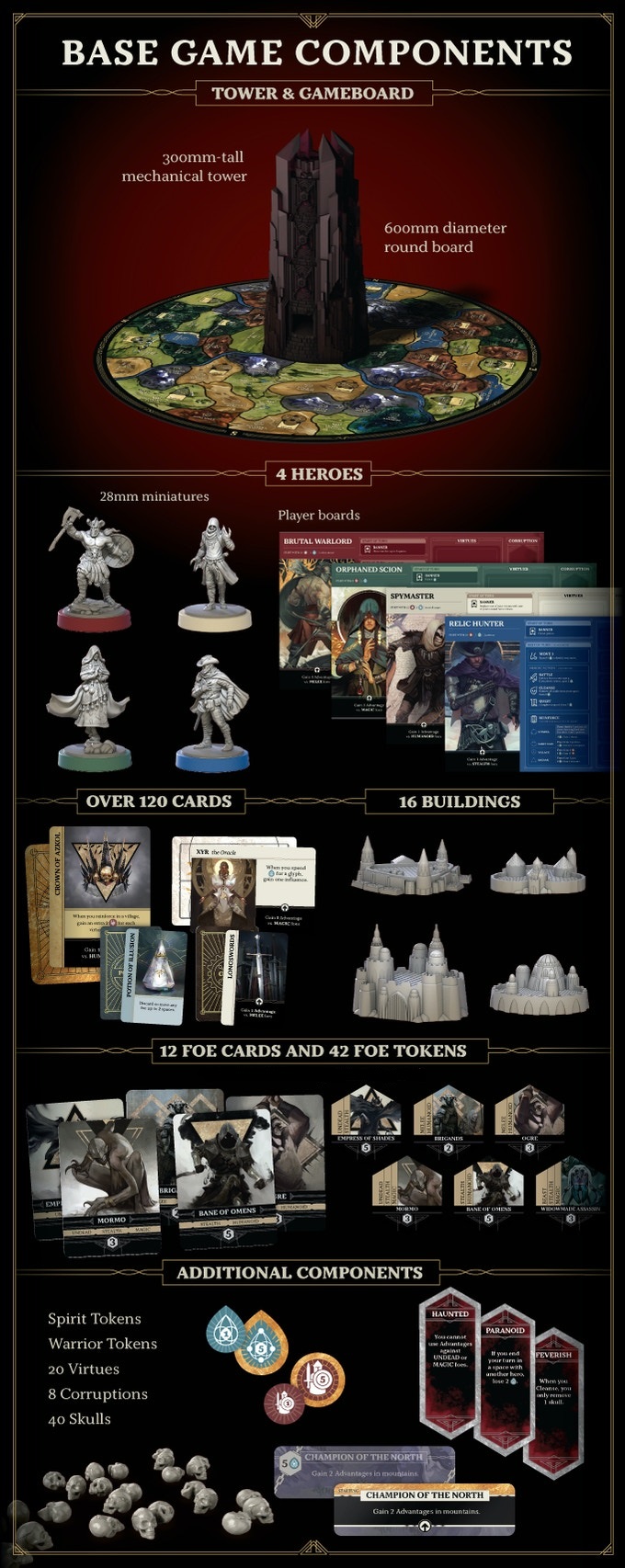 A “sequel” to the 1981 grail game, Return to Dark Tower is a game for 1-4 players who take the role of heroes. Together, they gather resources, cleanse buildings, defeat monsters, and undertake quests to build up their strength and discern what foe ultimately awaits them. When the heroes face the tower, the game shifts into its dramatic second act, where the players have one chance to defeat the enemy once and for all.