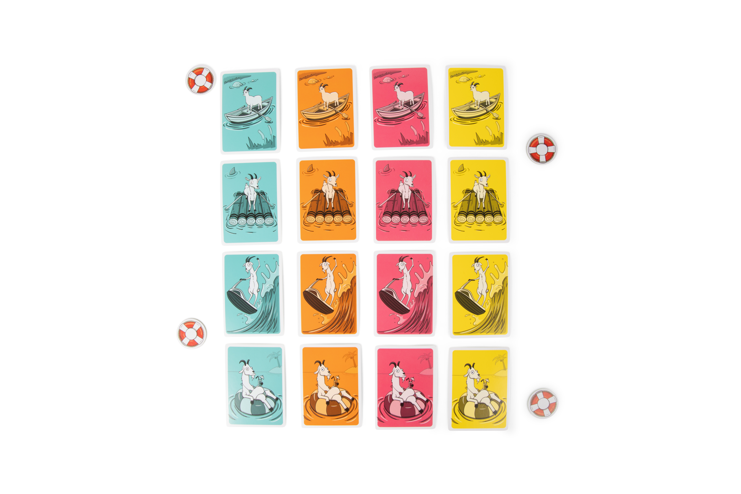 Row Your Goat is a rapid-fire picture-matching, fast slapping game. Get rid of your cards by placing them in a grid. The second you see a matching set of 3 in a row, slap the nearest Lifesaver. Hurry, there’s only a few of them. And if you don’t grab one fast enough, you’re left collecting cards. When you’re down to one card, scream “ROW MY GOAT”, play your card, and slap a Lifesaver to win.