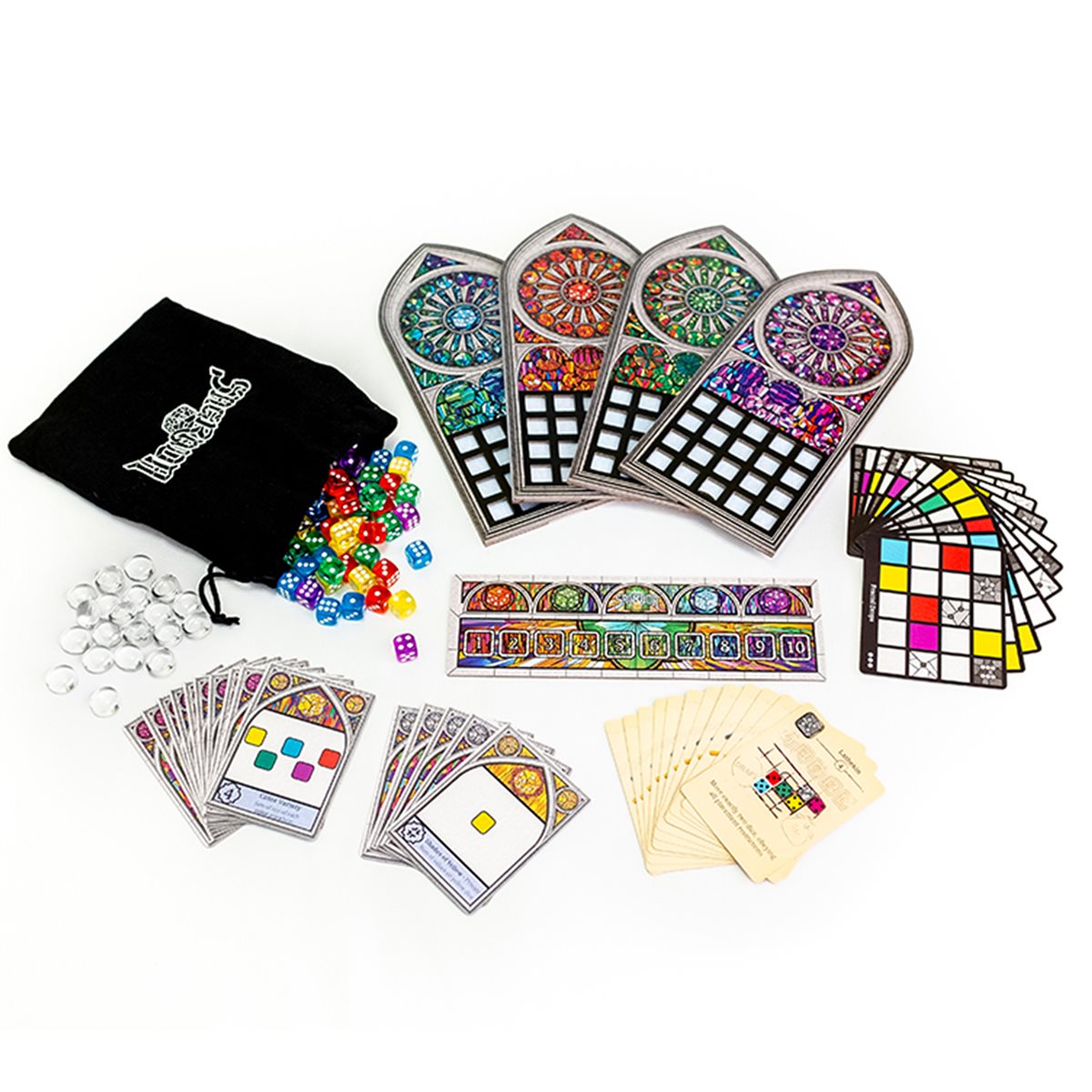 In more detail, each player builds a stained glass window by building up a grid of dice on their player board. Each board has some restrictions on which color or shade (value) of die can be placed there. Dice of the same shade or color may never be placed next to each other. Dice are drafted in player order, with the start player rotating each round, snaking back around after the last player drafts two dice. Scoring is variable per game based on achieving various patterns and varieties of placement…as well as bonus points for dark shades of a particular hidden goal color.
