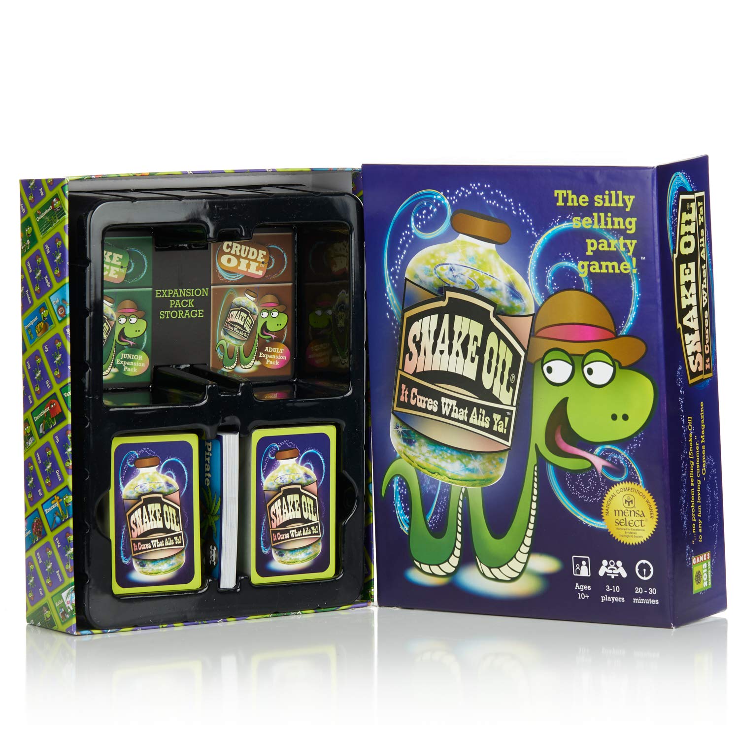 In the Old West, the wily snake oil salesman had a special talent, getting the most skeptical customers to buy the most dubious products. Now it’s your turn! Invent your own zany two-word products – Rumor Mirror! Burp Balloon! – and sell them to all types of wacky customers. If the round’s customer buys your product, you win!
