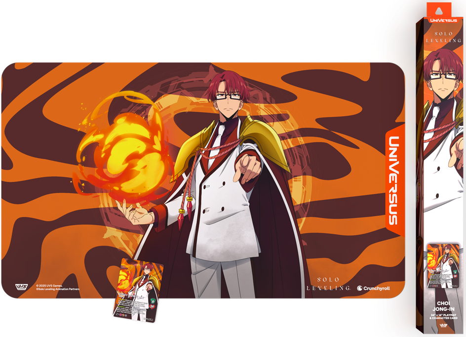 Bring the heat with the Choi Jong-In S-Rank Hunter Bundle. Korea’s top mage takes center stage in this high-impact release, which features a flame-themed character playmat and a character card featuring reskinned mechanics with art from an alternate universe that reflects his explosive combat style. Perfect for Solo Leveling fans who favor tactical control and elemental flair, this bundle adds serious firepower to any collection.