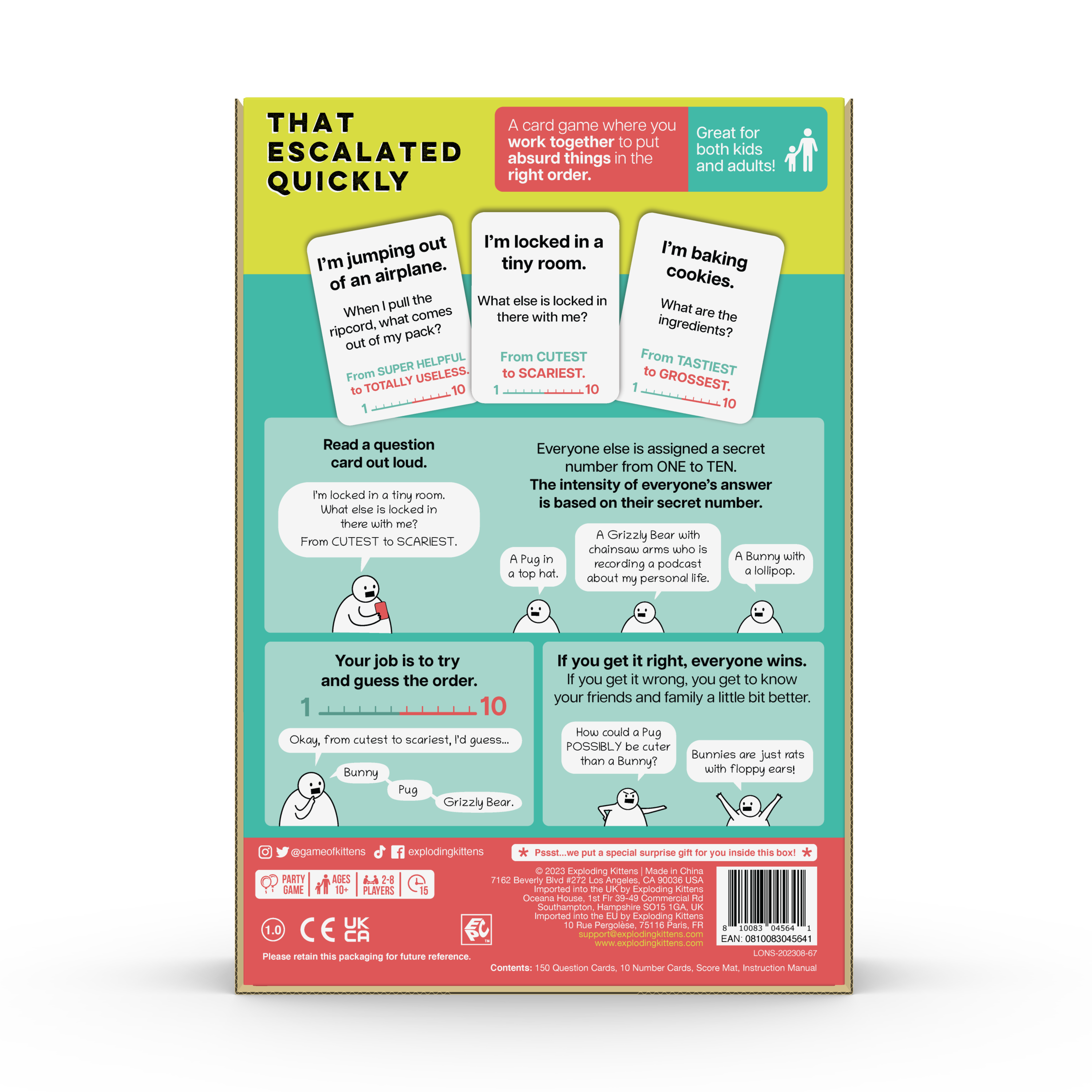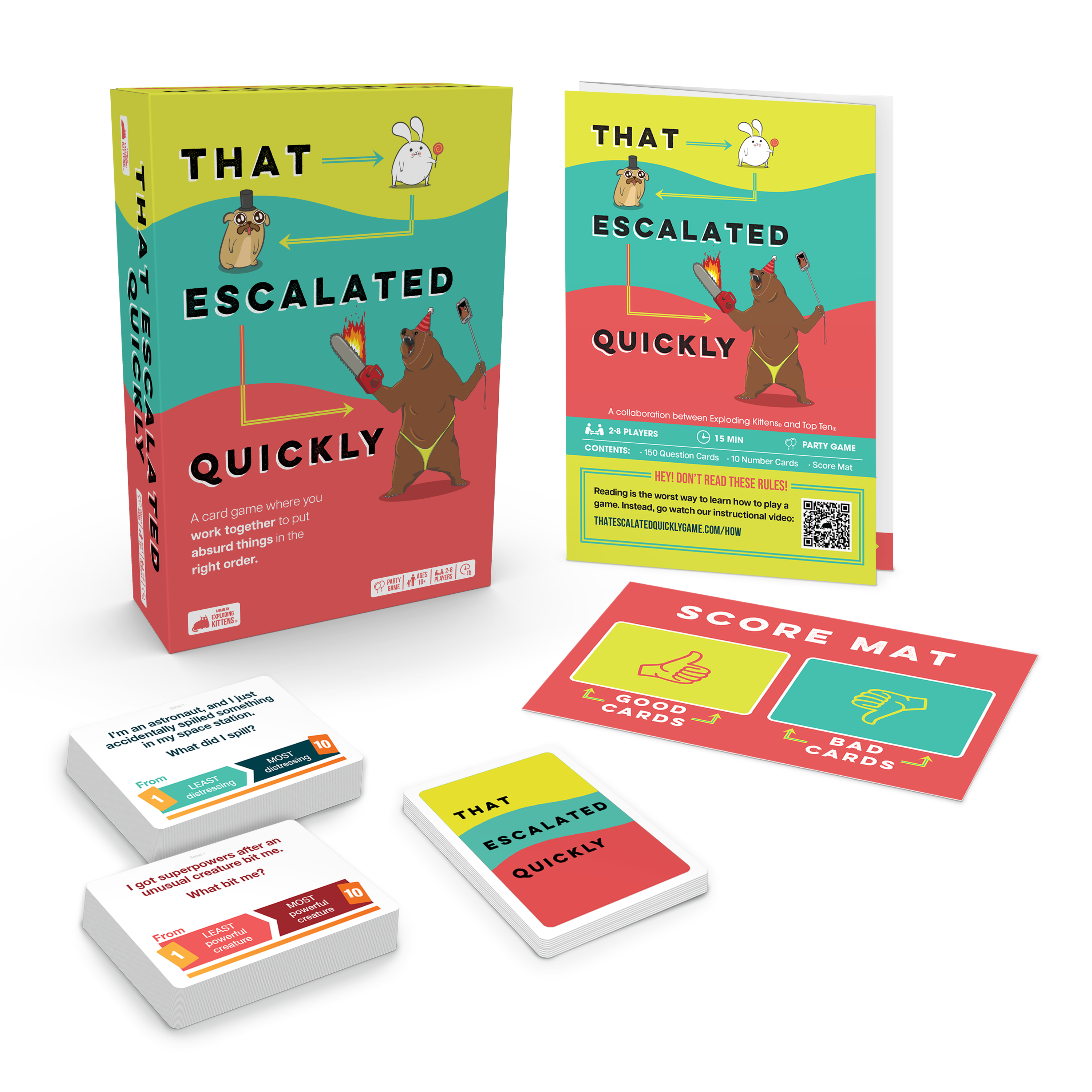 This is a reimagined version of “Top Ten”, a 2023 Spiel Des Jahres nominee by Cocktail Games. It’s a cooperative card game where you work together to sort out a bunch of nonsense. Score points by thinking like your teammates and order your cards in the correct ascending order. Read the prompts and admire the hilarious creativity of your friends.