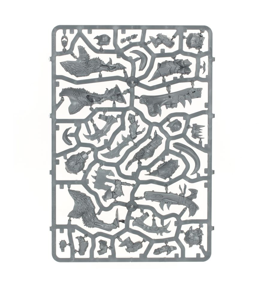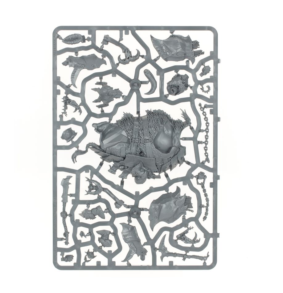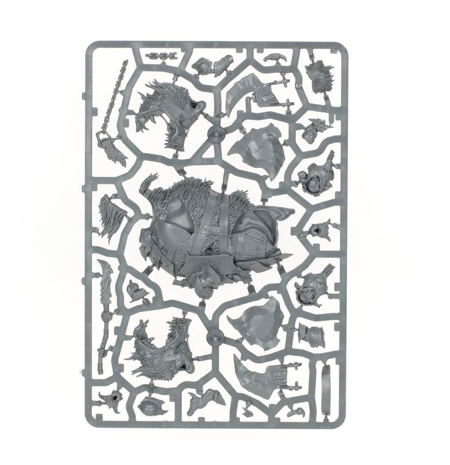 This multipart plastic kit builds a Tuskboss on Maw-Grunta – a fearless Ironjawz leader riding a porcine monstrosity. The Tuskboss steers his massive mount with a pair of thick chains, keeping a vicious pig-hacka strapped to his belt for close combat. He’s joined by a hakkin’ krew – two orruks chained to the sides of his steed, swinging huge kill-choppas to carve a path for their boss. The Maw-grunta crushes foes beneath its trampling trotters or gores them on its mighty tusks, protected by heavy armour – including intimidating head plates and tusk-mounted blades. It can also be adorned with an optional nose-ring.